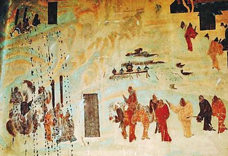 出土的高臺地埂坡胡人墓、西安安伽墓、史君墓、青海郭里木吐蕃墓棺板畫中都有關于商隊運營的場面,敦煌莫高窟壁畫、唐三彩中的胡商俑等,都為我們提供了生動的圖像資料。