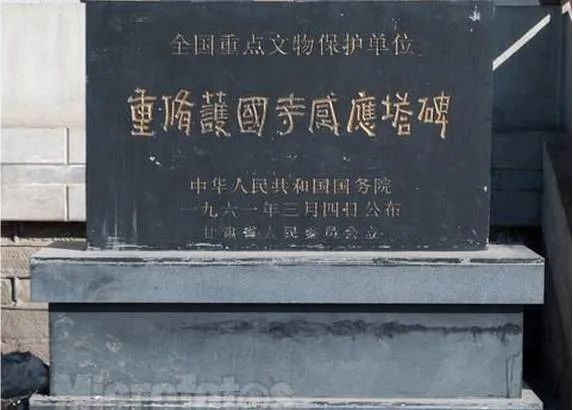 西夏碑,本名《涼州重修護國寺感通塔碑銘》,碑高26米,寬1米,厚03米。碑首呈半圓形,兩面正中用漢文和西夏文篆額,邊陰刻對稱的伎樂舞女,翩翩起舞,動作優(yōu)美,造型準確;舞女胸和手腕上有飾物,赤露上身、雙腳,下著長裙,面形肌肉豐滿,吸收了敦煌飛天的藝術(shù)特點。碑身的兩邊呈殺角,邊上刻忍冬紋。碑一面為西夏文,共28行,滿行65字。西夏文是一種被人們遺忘了的語言文字,無法辨認,當時被稱為“天書”。但碑的陽面為漢文,共26行,滿行76字。張澍先生見碑陽文末尾有“天祐民安五年歲次甲戌十五日戊建”落款,“天祐民安”為西夏年號,遂判定此碑為西夏碑文,因此,人們以后稱之為西夏碑。1961年就被國務(wù)院公布列為全國第一批重點文物保護單位。