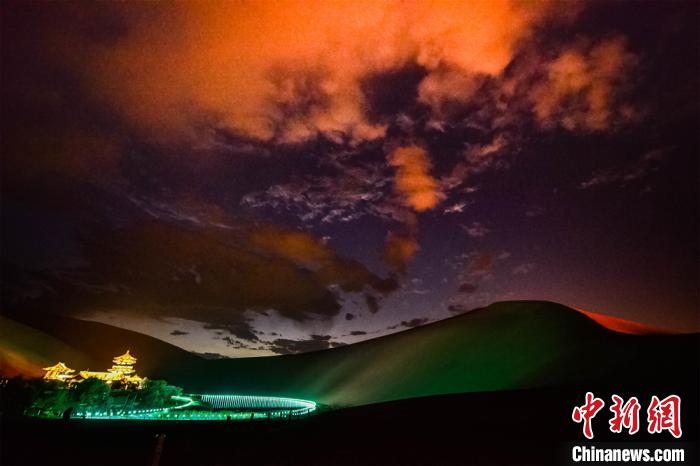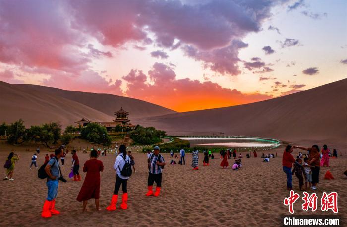 圖為游客觀賞月牙泉晚霞美景?!⊥醣筱y 攝