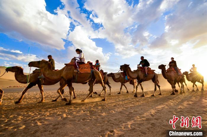 圖為游客騎駱駝觀賞大漠風景?!⊥醣筱y 攝