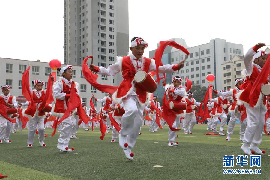 11月4日,蘭州市桃樹坪小學(xué)學(xué)生在活動(dòng)現(xiàn)場(chǎng)表演歡慶腰鼓。當(dāng)日,甘肅省蘭州市城關(guān)區(qū)學(xué)校體育“一校一品”現(xiàn)場(chǎng)展示活動(dòng)在蘭州市第五十四中學(xué)舉行,16所學(xué)校進(jìn)行了特色校園體育項(xiàng)目表演。據(jù)介紹,蘭州市城關(guān)區(qū)現(xiàn)已推廣各類體育項(xiàng)目40余項(xiàng),命名“體育特色項(xiàng)目示范校”42所。 新華社記者 張智敏 攝