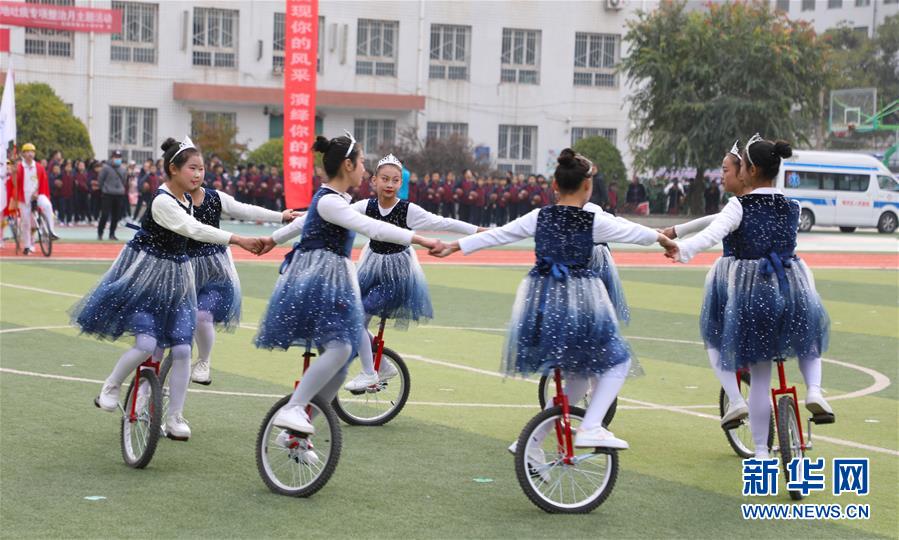 11月4日,蘭州市伏龍坪小學(xué)學(xué)生在活動(dòng)現(xiàn)場(chǎng)進(jìn)行獨(dú)輪車表演。新華社記者 張智敏 攝