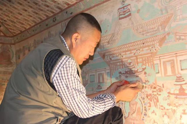 讓李曉洋最終留在這個(gè)行業(yè)的“決定性瞬間”發(fā)生在2014年,他和同事在莫高窟360窟開展壁畫修復(fù)。修復(fù)前,墻上的壁畫幾乎完全被浮塵遮蓋,損毀也很嚴(yán)重;修復(fù)后,壁畫變得清晰、線條十分明確。那一瞬間,他仿佛有穿梭千年的晃神,“這件事讓我很有成就感,覺得通過(guò)我們的努力,能夠讓更多人看到更精美的壁畫,值了。”