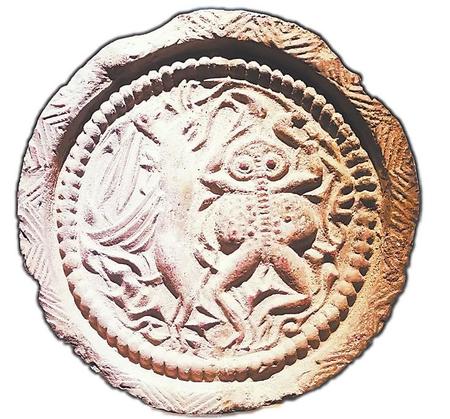 陜西淳化縣博物館收藏著一枚蟾蜍玉兔紋瓦當(dāng)。這枚蟾蜍玉兔紋瓦當(dāng)是國家一級文物,出土于咸陽市淳化縣西漢甘泉宮遺址。瓦當(dāng)面分上、下兩部分,上半部浮雕的是一只疾奔的小兔,兩前足躍起,雙耳后豎,尾巴上翹;下半部是一只起跳的蟾蜍,圓目突起,大腹鼓圓,舌長伸。瓦當(dāng)造型生動(dòng)傳神,極富生活情趣。在我國古代神話傳說中,蟾蜍、玉兔是月宮里的動(dòng)物,這個(gè)構(gòu)圖無疑是取自嫦娥奔月的神話故事。
