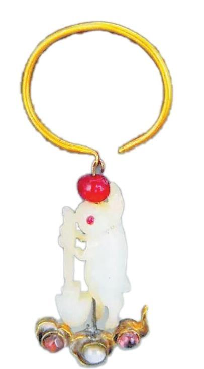 北京市昌平區(qū)十三陵定陵地宮明代定陵孝靖皇后的棺內(nèi),有一對金環(huán)鑲寶石玉兔耳墜。該金環(huán)鑲寶石玉兔耳墜中,兔子直立,雙耳上豎,玉色青白細(xì)潤,以紅寶石嵌飾雙眼,兩前爪抱杵作搗藥狀,下有臼,兔身上以細(xì)密陰線刻出毛發(fā)。
