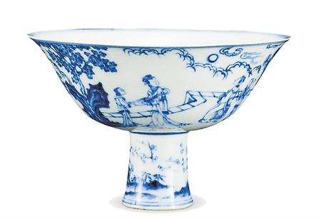 我國自古就有賞月祭月的習(xí)俗,這一習(xí)俗在文物里也有體現(xiàn),湖北省博物館收藏了一件青花瑤臺賞月圖瓷鍾。瓷鍾通高10.1厘米,口徑15.5厘米,足高4.6厘米,足徑4.2厘米,屬官窯出品,白胎,胎質(zhì)細(xì)膩,器壁光亮胎薄,叩之其聲如磬。瓷鍾上繪有“瑤臺賞月圖”,三組人物故事現(xiàn)于瓷鍾外壁:第一組有一老婦人側(cè)身坐在石墩上,身后站一侍女,雙手持扇,老婦對面站一年輕女子,其右側(cè)立一童子。第二組和第三組各有一青年女子和丫環(huán),畫面還有遠(yuǎn)山、祥云和花草。“瑤臺賞月圖”紋飾在瓷器界又被稱為“人物紋”,較為罕見,圖中人物共賞天上一輪圓月,與宋人所繪《瑤臺步月圖》一脈相承,意境優(yōu)美,風(fēng)格清新動(dòng)人。