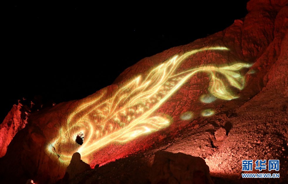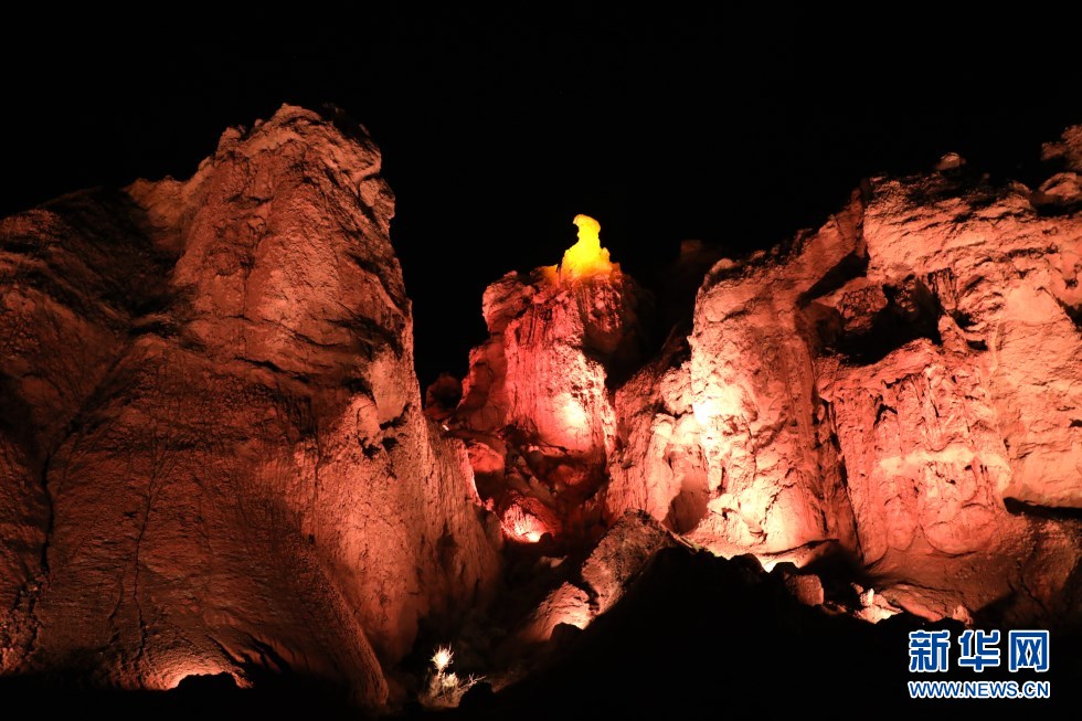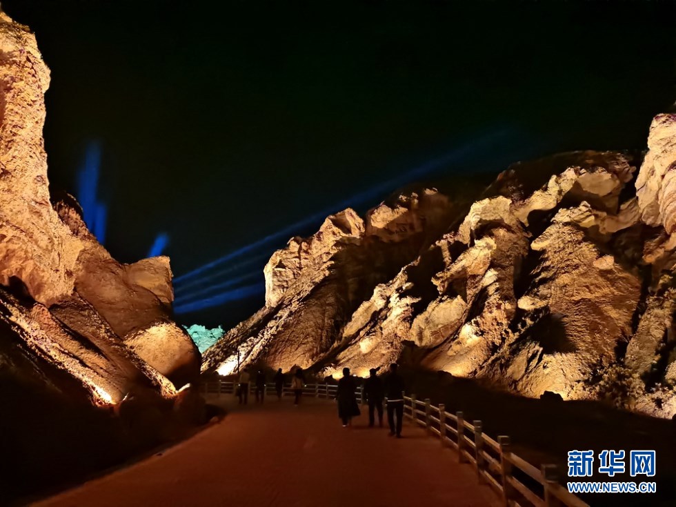 張掖七彩丹霞景區(qū)萬(wàn)象土林谷華燈閃爍。新華網(wǎng)發(fā)(童張偉 攝)