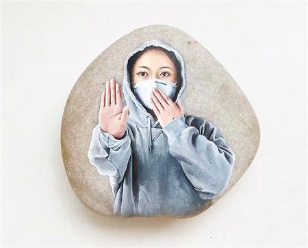 現(xiàn)在,馬玉蘭已完全掌握了“石畫”的技巧,跟隨石頭的形狀走勢設(shè)計畫面,利用凸出的部分打造光澤感,落筆時精準(zhǔn)控制力度,她將疫情之下平凡人的神韻生動地體現(xiàn)在每一次運筆中。