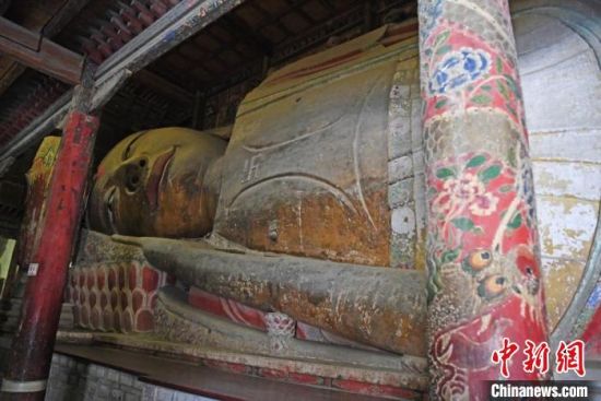 12月中旬,甘肅張掖大佛寺中重要文物的“數字孿生”打造工作已進入新階段。圖為木胎泥塑臥佛?!钇G敏 攝