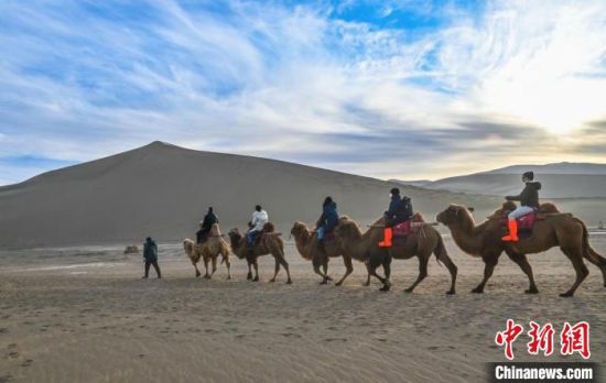 新年伊始,游客在敦煌鳴沙山騎駱駝欣賞大漠風(fēng)光。 王斌銀 攝