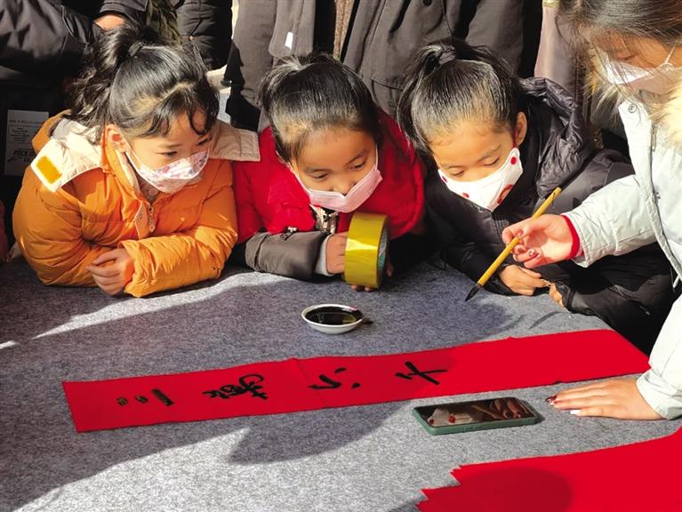 “千門(mén)萬(wàn)戶曈曈日,總把新桃換舊符”。書(shū)法老師們提筆蘸墨,行云流水,落筆如云煙,寫(xiě)成了一副副寓意吉祥美好的春聯(lián)。孩子們懷著一顆顆憧憬之心,圍繞在老師們的周?chē)?,幫忙擺放、晾曬春聯(lián)。最后,孩子們將老師寫(xiě)好的春聯(lián)送給了爸爸媽媽,以及前來(lái)參觀的游客們。