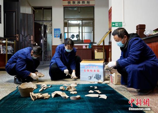 3月9日,甘肅平?jīng)鍪徐o寧縣博物館工作人員根據(jù)村民提供線索,在當(dāng)?shù)刭Z河鄉(xiāng)竇坪村發(fā)現(xiàn)仰韶文化人首型器口、石器、佩飾、彩陶片、紅陶片等文物標(biāo)本200余件。靜寧縣博物館工作人員表示,這一重大發(fā)現(xiàn)對(duì)研究當(dāng)?shù)貧v史文化有重要意義。 夏劍鋒 攝