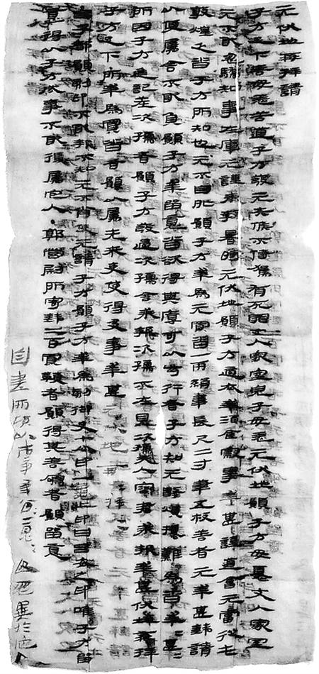 子方足下,善毋恙!苦道子方發(fā),元失候不侍駕,有死罪。丈人、家室、兒子毋恙,元伏地愿子方毋憂。丈人、家室元不敢忽驕,知事在庫,元謹奉教。暑時元伏地愿子方適衣、幸酒食、察事,幸甚!謹道:會元當從屯敦煌,乏沓,子方所知也。元不自外,愿子方幸為元買沓一兩,絹韋,長尺二寸;筆五枚,善者,元幸甚。錢請以便屬舍,不敢負。愿子方幸留意,沓欲得其厚、可以步行者。子方知元數煩擾,難為沓。幸甚幸甚!所因子方進記差次孺者,愿子方發(fā)過次孺舍,求報。次孺不在,見次孺夫人容君求報,幸甚,伏地再拜子方足下!所幸為買沓者,愿以屬先來吏,使得及事,幸甚。元伏地再拜再拜!