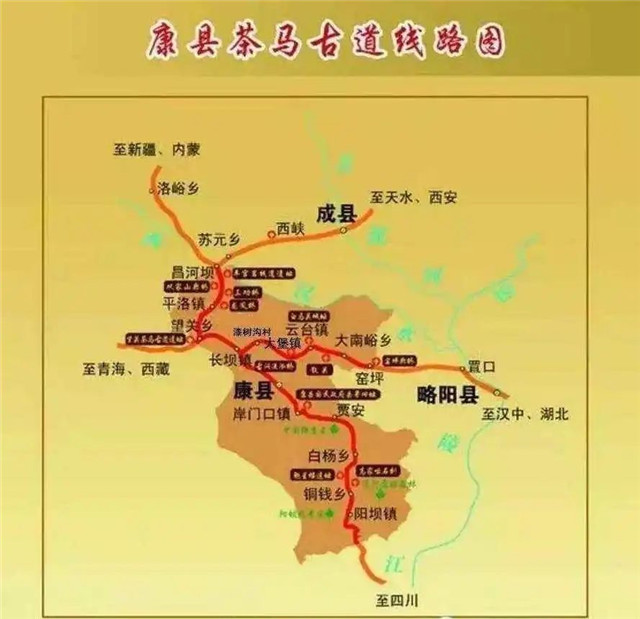 甘肅境內(nèi)的茶馬古道大致走向如下:茶葉由四川進入文縣,沿白龍江到達(dá)武都,經(jīng)宕昌到岷縣進而進入藏族地區(qū);由陜西進入隴南,經(jīng)成縣、西和到天水,經(jīng)甘谷、武山到達(dá)臨洮,在此可以分出兩條路徑,向北可達(dá)蘭州等地,往西可進入臨夏,進而進入藏族地區(qū)。