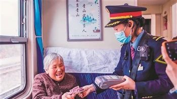 7505/7506次列車長在途中為老年旅客辦理現(xiàn)金補(bǔ)票業(yè)務(wù)。強(qiáng) 科 攝