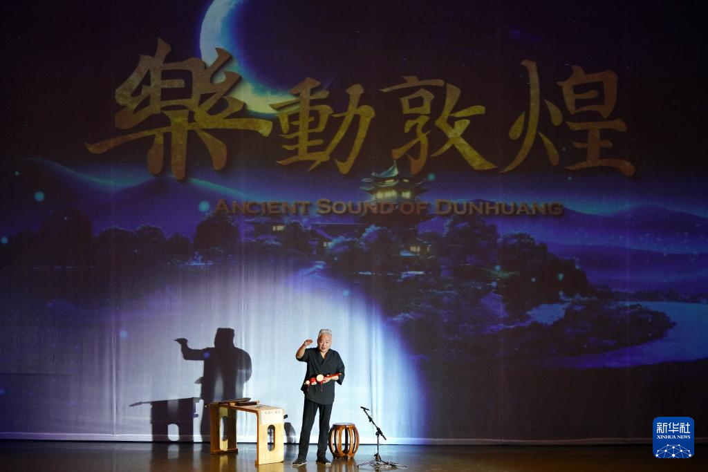 8月9日,在《樂動(dòng)敦煌》演出現(xiàn)場,敦煌古樂全球推廣大使、國樂藝術(shù)家方錦龍?jiān)谙蛴^眾介紹傳統(tǒng)音樂。新華社記者 馬寧 攝