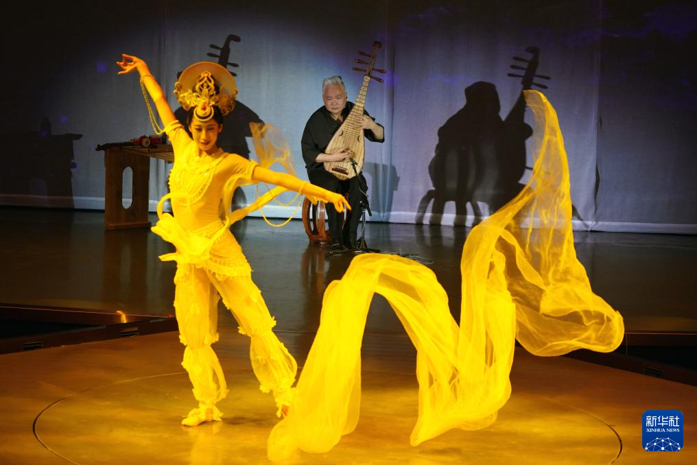 8月9日,在《樂動(dòng)敦煌》演出現(xiàn)場,敦煌古樂全球推廣大使、國樂藝術(shù)家方錦龍演奏琵琶,為舞蹈演員伴奏。新華社記者 馬寧 攝