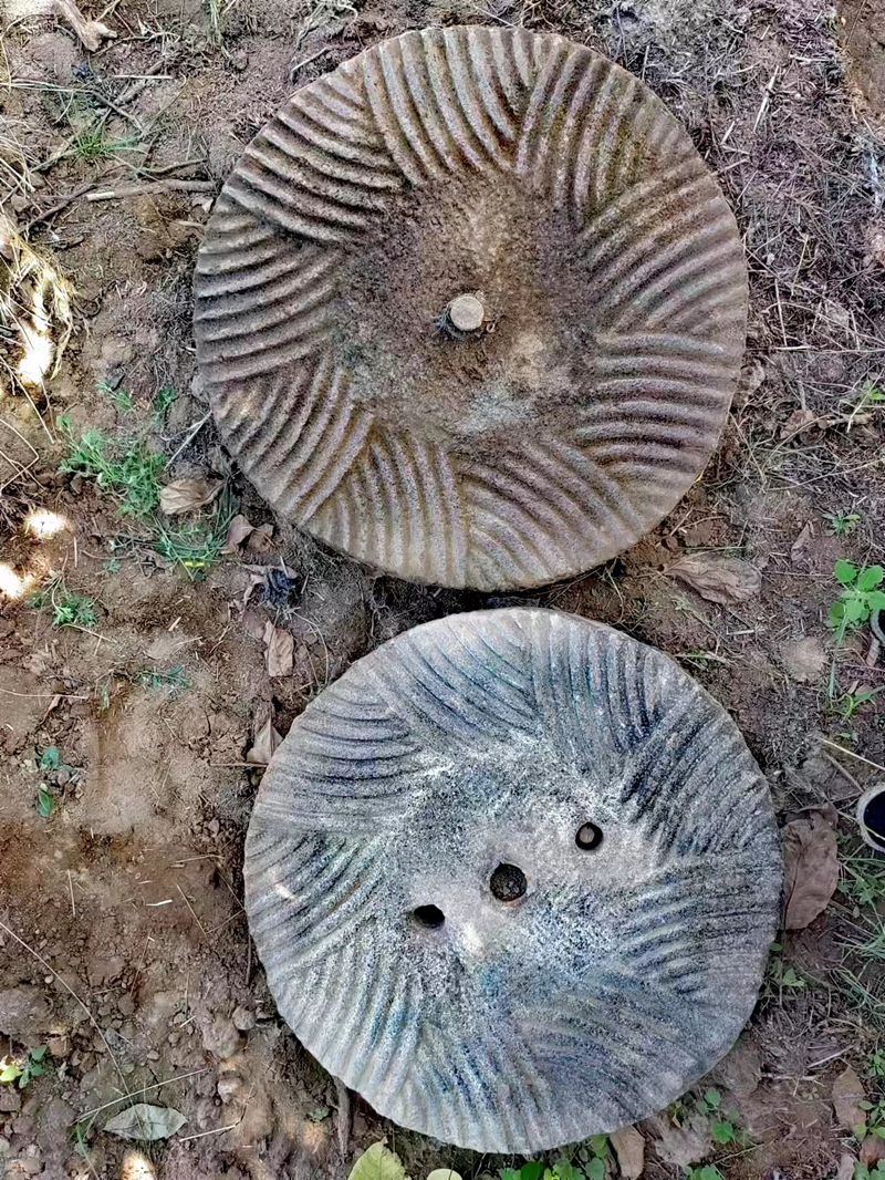 鑿石磨,其實(shí)也就是礪紋利齒。首先,將上扇抬起來放在地上鑿,下扇是固定在磨盤上面的,搬一條高凳子坐在上面鑿。上下兩扇的磨齒排列有序,互相對稱咬合,呈扇狀向四周延伸,極其科學(xué)合理。石匠就是把這些變鈍了的磨齒一錘一纖鑿鋒利。