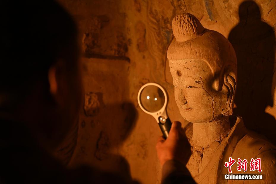 有時(shí)候看似簡(jiǎn)單的佛像修復(fù)會(huì)遇到各類不同的文物病害,修復(fù)時(shí)間會(huì)長(zhǎng)達(dá)三年之久,他也見證了文物修復(fù)技藝的變遷。隨著科技進(jìn)步文物修復(fù)手段也變得越來(lái)越先進(jìn),他認(rèn)為未來(lái)的文物保護(hù)工作一定會(huì)越來(lái)越好,年輕文保工作者們也一定會(huì)想盡更多辦法留住這座世界文化遺產(chǎn)。圖為8月25日,文物修復(fù)師牟常有正在仔細(xì)觀察佛像表面出現(xiàn)的病害問題。李亞龍 攝