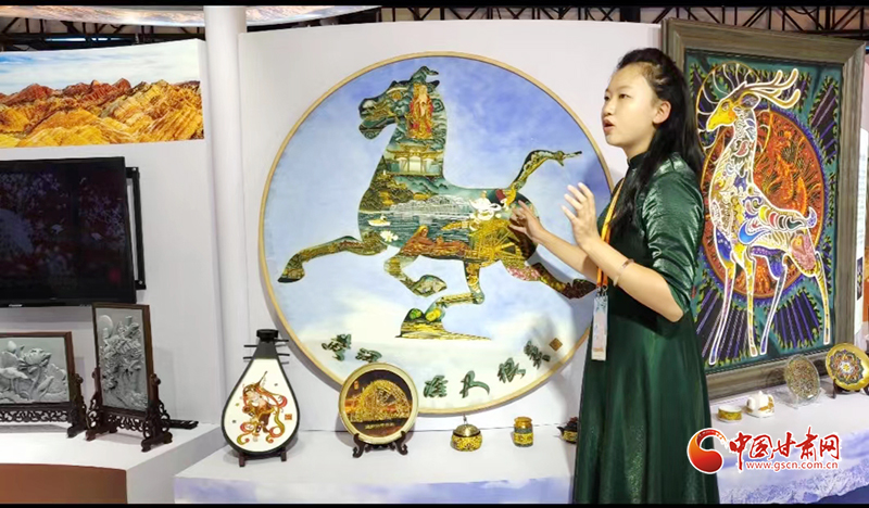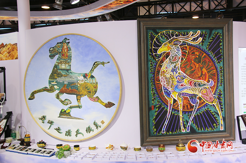 和阮琳的刻葫蘆一樣,由甘肅李明?,m瑯壁畫文化傳承發(fā)展有限公司展呈的“黃河之濱也很美”和靈動(dòng)的九色鹿等充滿敦煌元素的掐絲琺瑯壁畫流光溢彩,精美絕倫,參觀問詢著絡(luò)繹不絕。