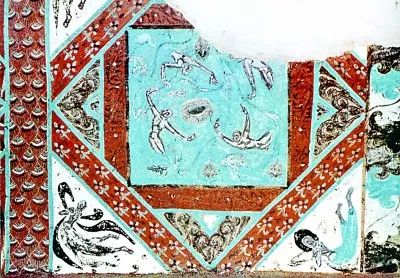 在莫高窟420窟中,還有一幅展現隋代游泳活動的畫面。圖中兩位游泳者正在模仿爬行的動作,呈兩腿交替打水、兩臂輪流劃水狀,頭部均轉向一側吸氣,類似現在自由泳中的基本動作和吸氣方式。