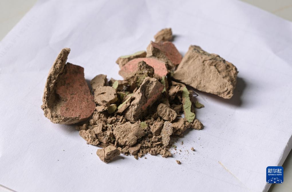 在秦始皇帝陵博物院文物保護(hù)部彩色陶俑修復(fù)室內(nèi)的工作臺(tái)上擺放著發(fā)掘出土的土塊,這些剝落的彩色土塊正等待修復(fù)人員采用精湛的技術(shù)復(fù)原(8月23日攝)。