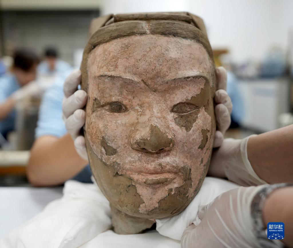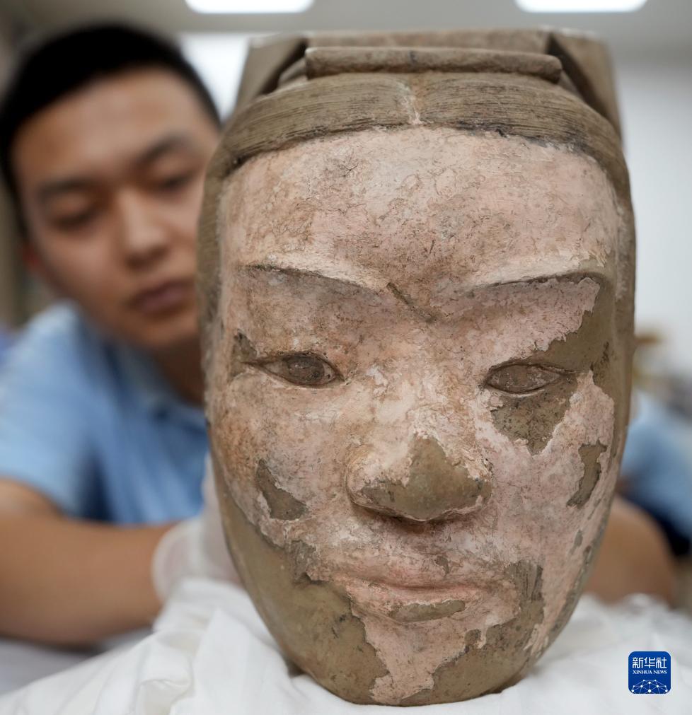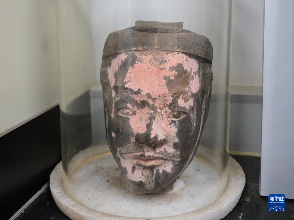 這是秦俑俑頭彩繪還原修復(fù)后的樣貌(8月23日攝)。