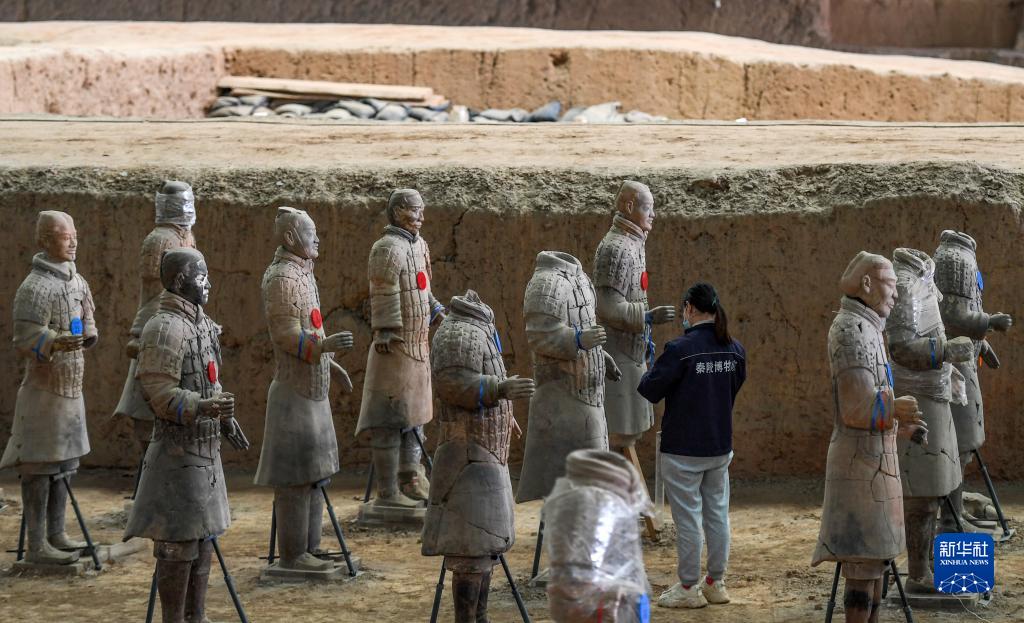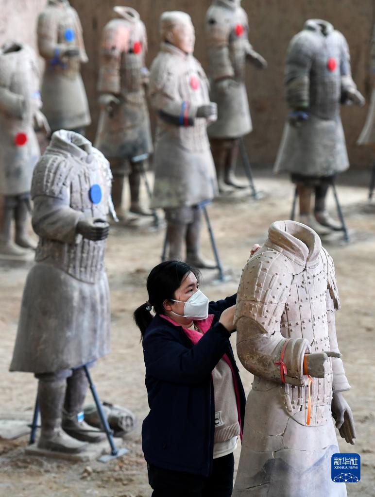 工作人員在秦兵馬俑一號(hào)坑遺址進(jìn)行秦俑修復(fù)(4月26日攝)。