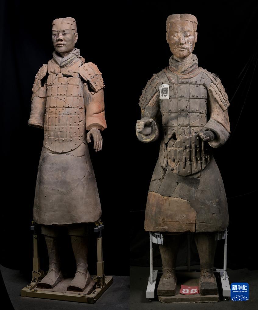 兩尊經(jīng)過(guò)修復(fù)的彩色秦俑佇立在秦始皇帝陵博物院文物保護(hù)部彩色陶俑修復(fù)室內(nèi)(拼版照片,8月23日攝)。