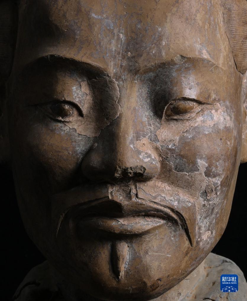 在秦始皇帝陵博物院文物保護(hù)部彩色陶俑修復(fù)室內(nèi),一尊秦俑臉部尚存部分彩繪層。秦俑五官的精準(zhǔn)塑造顯示出秦代匠人具有高超的寫實(shí)能力(8月23日攝)。