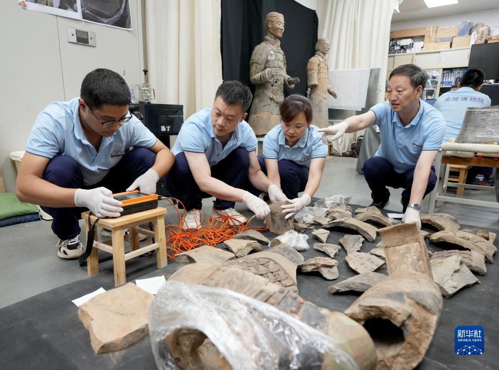 秦始皇帝陵博物院文物修復(fù)專家蘭德?。ㄓ乙唬┰谥笇?dǎo)技術(shù)人員運(yùn)用超聲波儀器測(cè)量秦俑胎體的密度(8月23日攝)。
