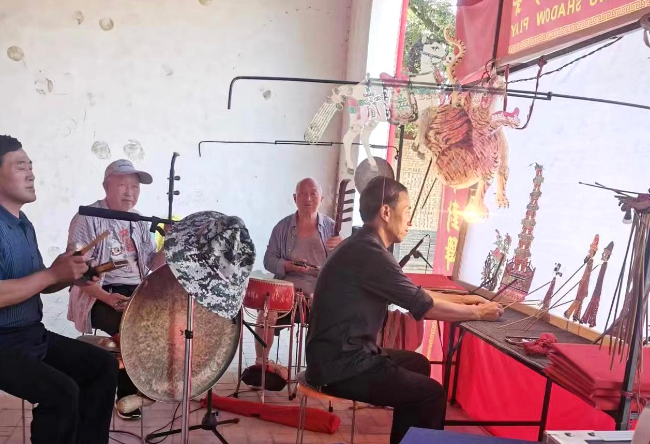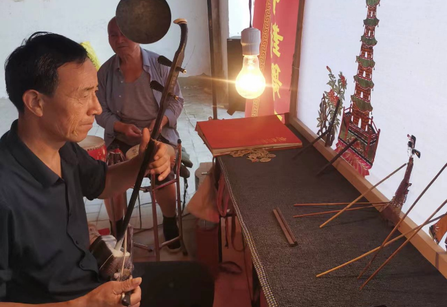環(huán)縣道情皮影戲的價值主要體現(xiàn)在優(yōu)美獨特的道情音樂唱腔和精湛的皮影制作及表演上。戲班演出時,前臺一人挑扦表演,并承擔(dān)所有角色的坐唱念白,后臺四五人伴奏并“嘛簧”,一唱眾和,粗獷高亢,獨具風(fēng)格。伴奏樂器中的四弦、漁鼓、甩梆子、簡板均為自制,音色獨特,傳唱劇目有180余部,至今還保留著“圖”“卷”等古老文化符號。