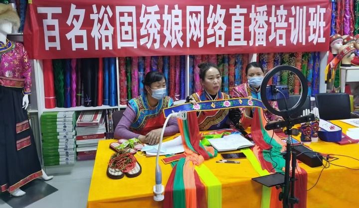 2021年11月,獲得甘肅省鄉(xiāng)村工匠名師稱號的潘小紅(中)帶領(lǐng)姐妹通過網(wǎng)絡(luò)直播幫助更多人學習刺繡技巧。新華社發(fā)(佘萬青攝)