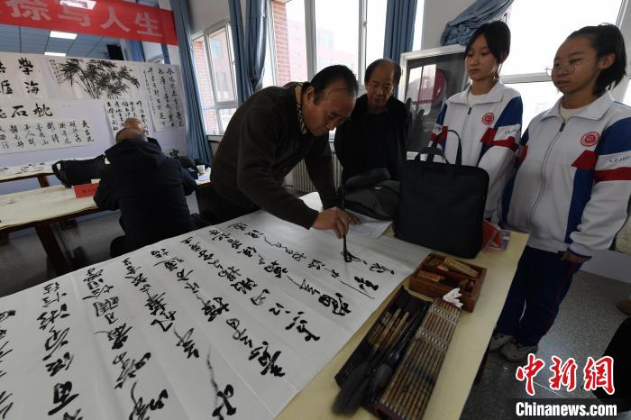 圖為書法家在蘭州交通大學(xué)附屬中學(xué)現(xiàn)場書法交流。戴文昌 攝