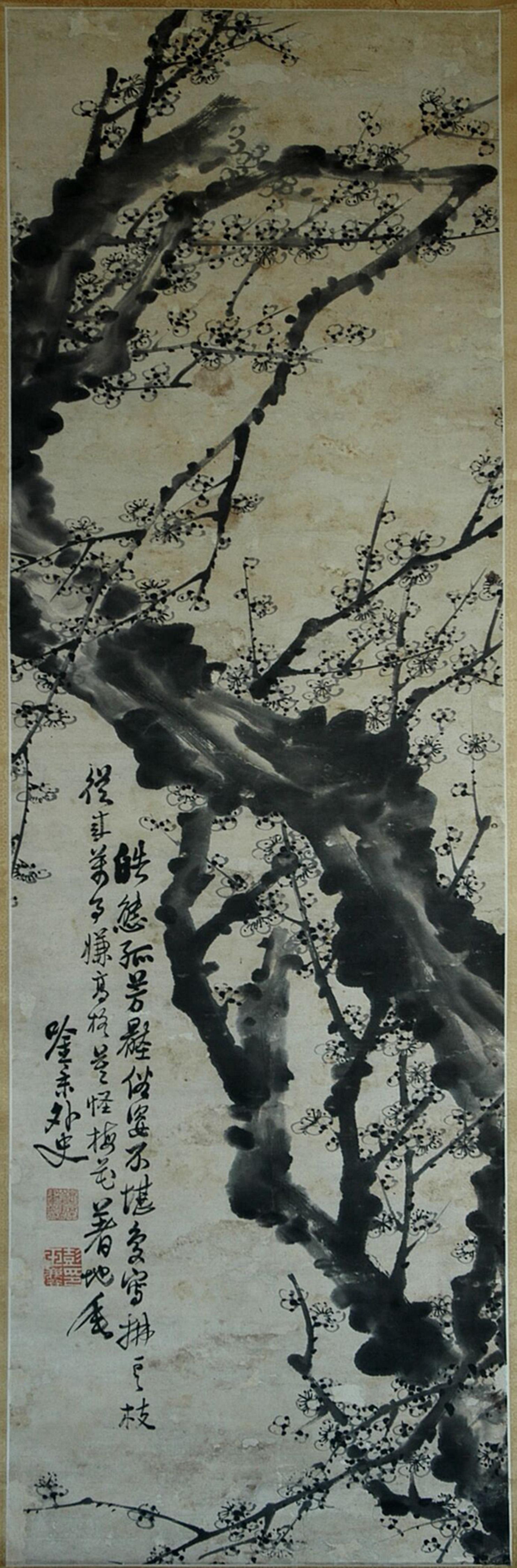 彭玉麟一生所作梅花不下萬幅,清水縣博物館館藏的這幅梅花圖屬館內(nèi)舊藏,其來歷已無從考證。這幅立軸梅花圖長133厘米,寬42厘米。畫面上,一棵下不見根底的老梅,蜿蜒盤旋凌空而上,好似神龍擺尾,顯得古拙蒼勁,點(diǎn)點(diǎn)梅花用寫意筆法一揮而就。畫作不著顏色,老干繁枝,遒勁如鐵,寒梅點(diǎn)點(diǎn),暗香浮動(dòng),散發(fā)著濃厚的文人畫氣息。