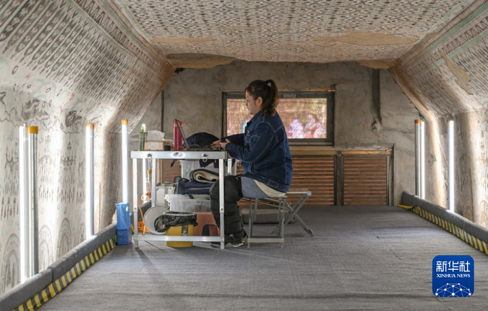 在敦煌莫高窟正在保護(hù)修繕的第55窟內(nèi),一位文保工作者對采集的數(shù)據(jù)進(jìn)行整理(2023年8月3日攝)。新華社記者 李賀 攝