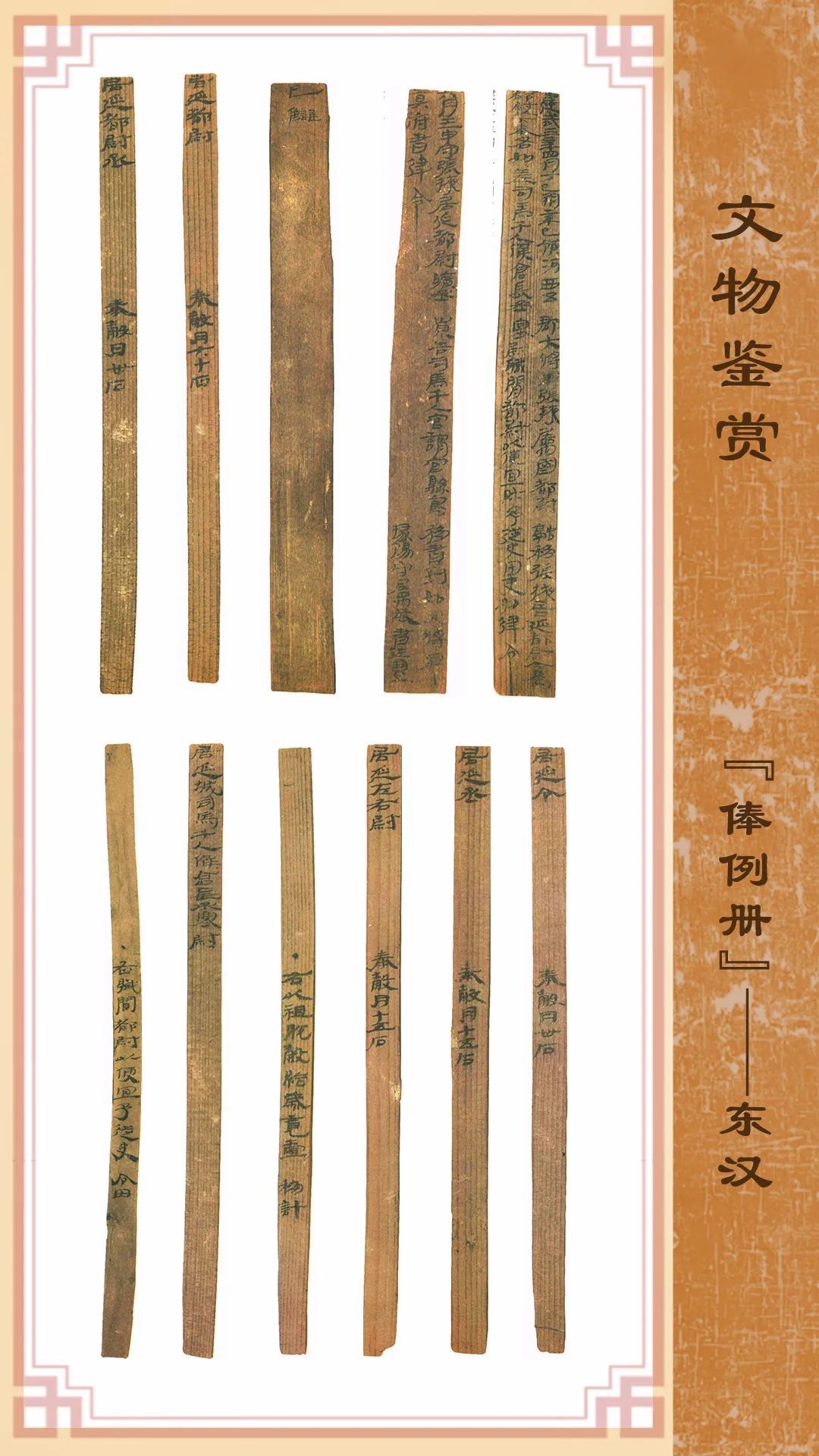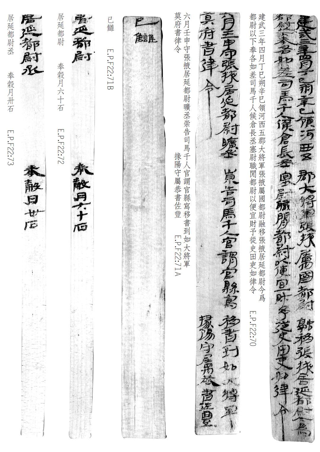 1974年8月出土于甲渠候官遺址第22號(hào)房址內(nèi)。簡冊由10枚簡組成,每簡長22.8厘米,前兩簡寬2.5厘米,其余8簡寬1.4厘米。全文200字。內(nèi)容為東漢建武三年(公元25年)竇融統(tǒng)治河西期間留下的一份完整的財(cái)政文書。簡文是關(guān)于居延都尉府吏員奉谷標(biāo)準(zhǔn)的通知,由領(lǐng)河西五郡大將軍張掖屬國都尉竇融幕府下發(fā),簡言“如律令”可知其指令具有法律效力。