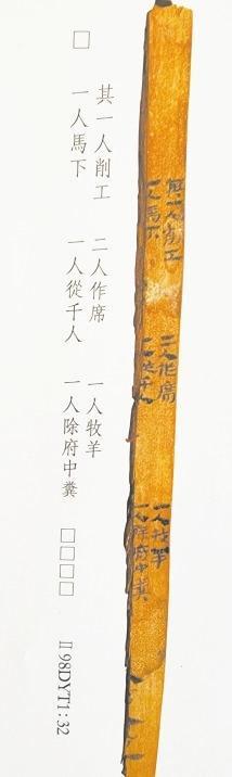 簡(jiǎn)7是都尉府戍卒日作簿,戍卒分工簡(jiǎn)明清楚。“削工”用紅柳、胡楊木削制簡(jiǎn)牘。作席,疏勒河沿岸生長(zhǎng)著大量芨芨草、蘆葦,戍卒用來編制席笆,用于防潮御寒。疏勒河沿岸水草豐茂,適宜放牧。“一人牧羊”可知,養(yǎng)牛、羊供都尉府吏員食用。“一人馬下”,由于缺當(dāng)時(shí)的語(yǔ)言環(huán)境,釋義模糊。千人是都尉府中級(jí)軍官職務(wù)。除府中糞,清除廁所糞便。