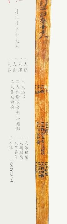 簡(jiǎn)8是某月2日,17名戍卒勞作記錄。削同削工。繩,搓麻繩。一人山,缺當(dāng)時(shí)語(yǔ)言環(huán)境,不可釋。養(yǎng),烹煮,做飯。三人馬下,同簡(jiǎn)7中的“一人馬下”。尉丞、功曹是都尉府中下級(jí)軍官職稱。尉丞舍、功曹舍,舍,宿舍,4名戍卒分別維修、加固尉丞和功曹的宿舍。橥,是拴牲口的木樁,治豬橥,即用木樁圍豬欄,說明玉門都尉府養(yǎng)豬。莝,鍘草,莝養(yǎng)牛,即鍘草養(yǎng)牛,說明玉門都尉府養(yǎng)牛。