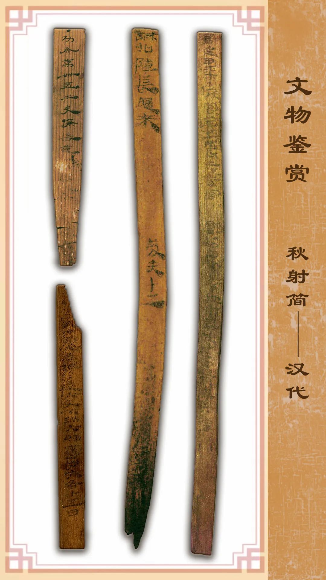 這是漢代邊塞有關(guān)“秋射”的一組散簡(出土編號分別為:EPT52:95、EPT53:34/41、EPT11:1),都是一行書寫。1974年出土于甲渠候官遺址。其中一枚簡(EPT53:34)是關(guān)于邊塞軍官秋射考核的令文;兩枚簡(EPT52:95、EPT53:41)是秋射考核記錄;簡EPT11:1記錄了秋射賜勞的規(guī)定。