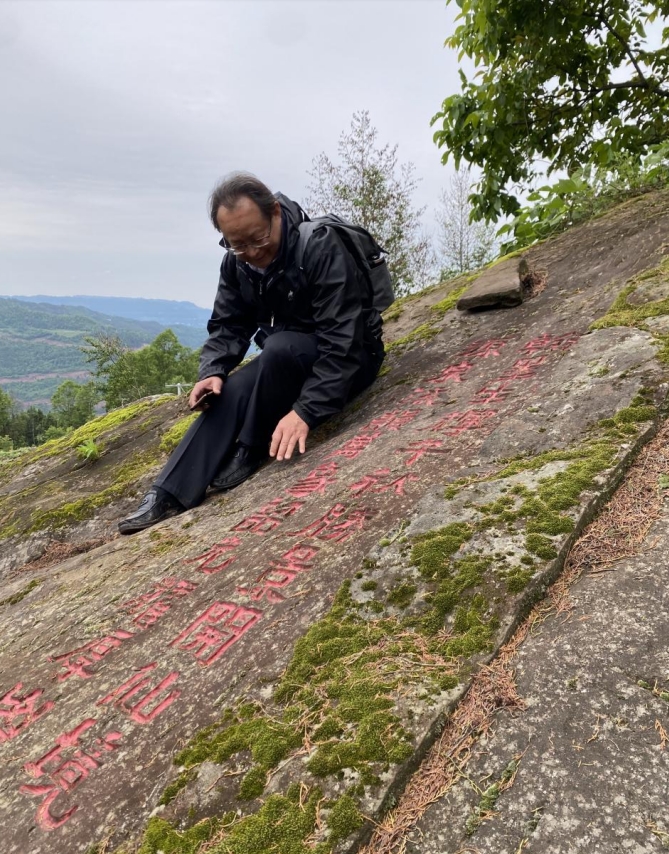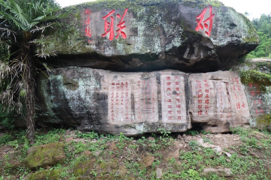 山上隨處是石,或臥或立,俱有雄獅虎豹之勢;或平或峻,皆作岡陵之態(tài)。青峰續(xù)脈,絕頂鷹飛。鑿巖壁以造法像,栩栩如臨宮闕;摩巨石而鐫嘉聯(lián),文華直射牛斗。石多瑰偉,苔覆璞瑜,油菜花點綴其間,引來蜜蜂蝴蝶共舞。山茶與毛竹同畦,郁郁蔥蔥;峰巒與云煙共養(yǎng),莽莽蒼蒼。遇目石上鐫字,瀏賞翰墨煙霞;振藻揚毫,皆寰中俊杰;椽筆斯文,多隴蜀賢達?;虺嘧痈文?,燭照于史;或凜然浩氣,嘯傲大千。聯(lián)壁生輝,文曲星彰;峣巖開竅,氣通神明。文采煥然與星河同輝,詩儕競秀潤厚山玉顏。壯懷詩夢,漱玉溪流。在一塊巨石斜面上,有同伴發(fā)現(xiàn)刻有筆者所書長聯(lián),興奮得喊叫起來。這是三年前應(yīng)曹興章先生之約而作,聯(lián)曰:翰墨生輝,千秋勝景開仙境;源泉流韻,萬象韶光耀厚山。我用手指扣去筆畫生出的茂密青苔,坐下來與我的聯(lián)合影留念。信是蓮花開石上,遙遙至此結(jié)仙緣。