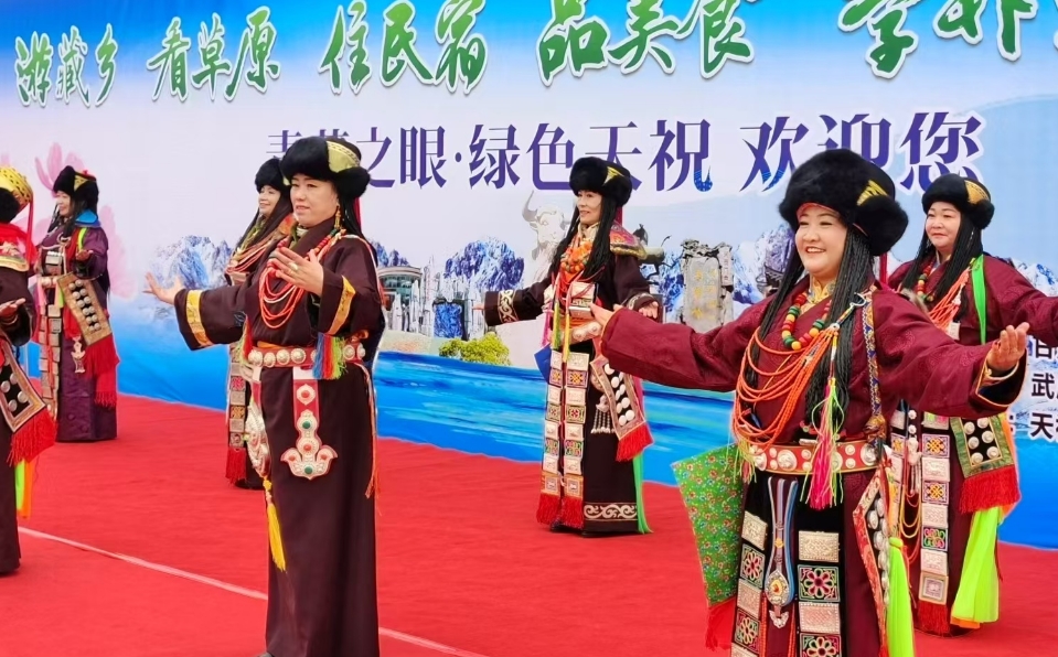 在天??h抓喜秀龍阿尼嘎卓帳篷城,身著藏族服飾的美麗卓瑪向采風(fēng)團獻上了潔白的哈達,華銳藏歌、華銳則柔、華銳鍋莊等獨具特色的文藝演出讓現(xiàn)場觀眾拍手稱贊。