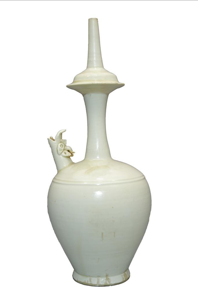 胎白質(zhì)細堅致,釉白泛黃,底足無釉。采用堆塑技法,小口長頸,頸中部飾一相輪狀圓盤,下頸束腰,圓肩鼓腹下收,圈足外撇。肩腹交接處飾弦紋三道,肩的一側(cè)塑龍首流。