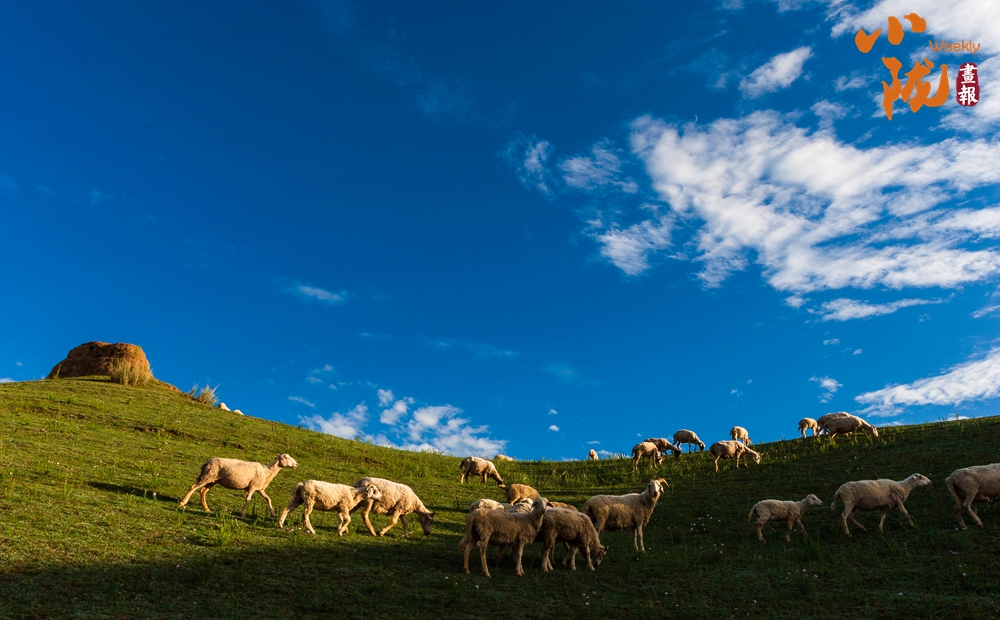 遠處白云悠悠,百萬畝草原一望無垠,羊群點綴的大草原和那殘存的烽火臺相映成趣,呈現出一幅綠意盎然的詩意畫卷。