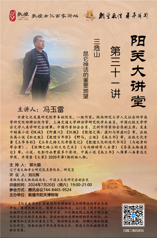 中國甘肅網7月18日訊 7月20日,西北師范大學甘肅文化發(fā)展研究院常務副院長、一級作家、玉文化學者馮玉雷將在線進行題為《三危山:昆侖神話的重要地望》的講座。本次講座由敦煌陽關博物館主辦,為“敦煌文化百家講壇”第31講,遼寧省文物考古研究院名譽院長、資深考古學家、玉學家郭大順研究員擔綱主持,陜西省文物局原副局長、中國玉文化研究會副會長、資深玉學家劉云輝教授擔綱評議。