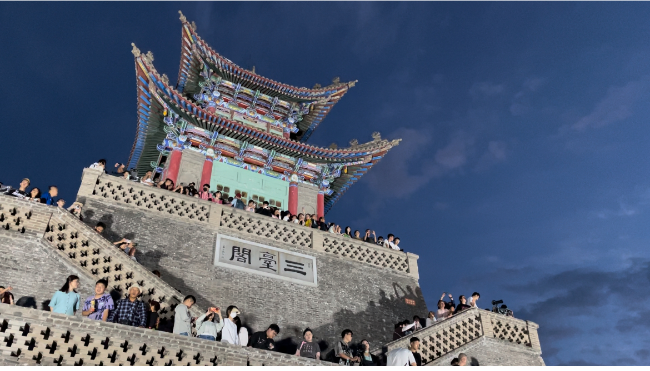夕陽(yáng)西下,夜色漸濃,三臺(tái)閣上游人如織,山下的萬(wàn)家燈火隨著夕陽(yáng)余暉的隱退漸漸蘇醒,一盞盞燈光次第亮起,璀璨如星海。人們紛紛舉起手機(jī)和相機(jī),記錄下這一刻的美好。“真不愧是金城蘭州,站在這里俯瞰蘭州是什么神仙視角!”“終于知道夜晚的蘭州為啥被稱(chēng)作‘蘭哈頓’了,回去好好跟朋友炫炫……”來(lái)自陜西的大學(xué)生小劉和他的小伙伴們一邊尋找拍照最佳角度,忍不住發(fā)出贊嘆。在這一刻,古老的閣樓與游客一起沉醉在蘭山的夏夜晚風(fēng)中?!?/p>
