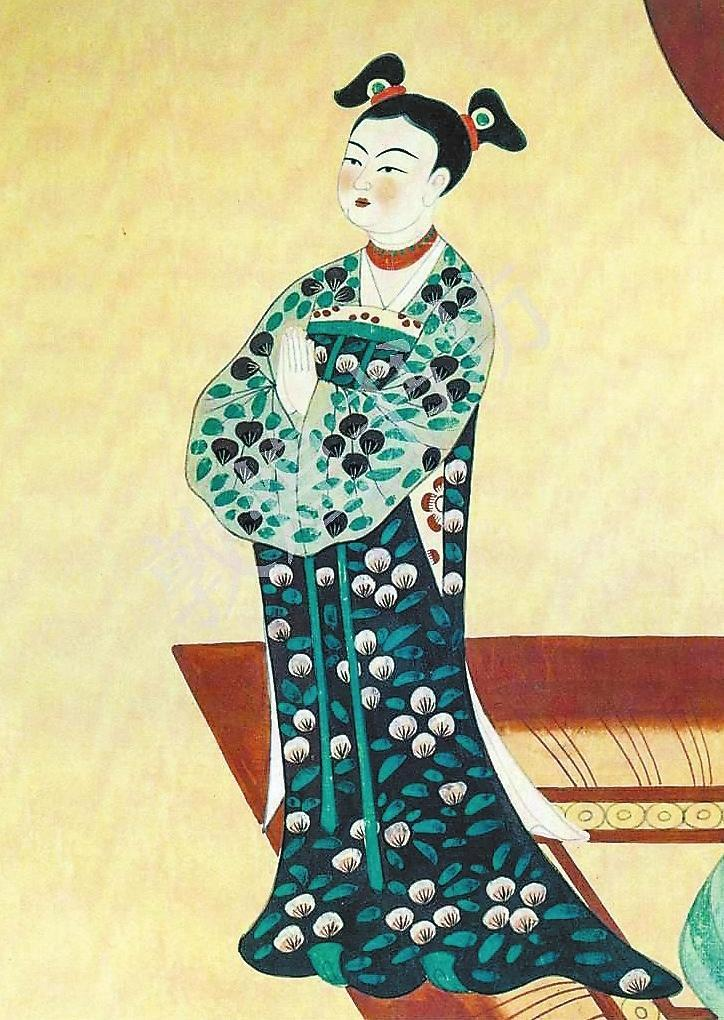 我們都知道服裝最經(jīng)典的配色是黑白灰,尤其是黑白配,其實(shí)這種配色也是敦煌壁畫中的經(jīng)典。在莫高窟第100窟壁畫中有一幅“舞者圖”:畫面上男舞者被定格在一個扭腰送胯雙臂屈伸的舞蹈動作中,他上身穿著中長款的黑色圓領(lǐng)長袖缺胯衫,用白色帛帶束腰。下身則搭配一條白底團(tuán)花大口褲。在莫高窟第12窟壁畫中有一幅“供養(yǎng)人圖”:畫面上一對母女身著襦裙,上襦下裙的著裝風(fēng)格相當(dāng)于今天服飾的無袖連衣裙加一件長袖開衫。在畫面上女兒的上衣和媽媽的裙子是同樣的藍(lán)色,女孩的裙子和媽媽上衣是同為赭色,只不過各自的花紋樣式不同,但是母女倆胸前的結(jié)帶卻是同色同花、一模一樣。畫師如此別出心裁的呼應(yīng),顯得既溫情又醒目。