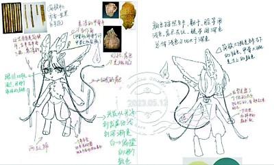 “這是我們設計的吉祥物‘活字’,它的周邊懸浮著一圈漢簡,頭是動漫風格的獸首,兩個獸角是甲骨片的樣式,棕色的身體呼應了埋藏西北漢簡的沙漠。”負責工作室運營的學生興致勃勃地介紹著設計圖。他們告訴記者,吉祥物尾巴參照三星堆青銅神樹做成了燈盞的樣式,上面承載一個火種。它既有指引之義,又象征著中華文化傳承不滅。
