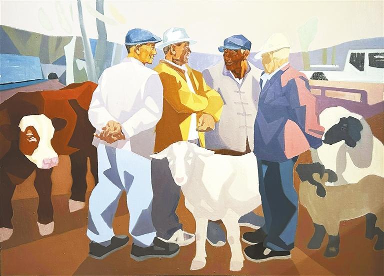 《和風(fēng)》系列作品取材于禮縣鹽官鎮(zhèn)騾馬市場(chǎng)逢集時(shí)交易的場(chǎng)景。幼時(shí),我經(jīng)常隨父親去鹽官騾馬市場(chǎng)趕集,對(duì)這個(gè)場(chǎng)景熟悉且親切。也正因?yàn)槿绱耍覍?duì)這個(gè)題材有著難以割舍的情愫,總是忍不住想通過(guò)畫(huà)筆呈現(xiàn)這一記憶。