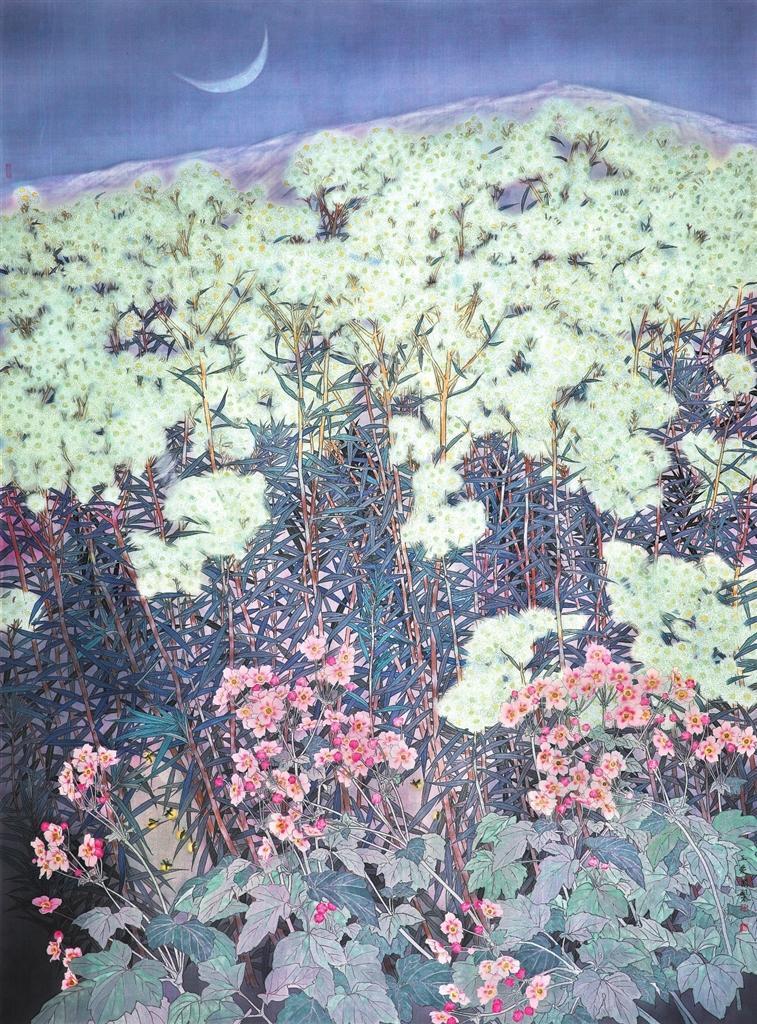 《白露》主要以白色野花香青為主體,野棉花為輔。拉長(zhǎng)香青的枝干,以增強(qiáng)畫(huà)面的氣勢(shì),繁茂的白花溫馨、浪漫,婀娜的野棉花花朵打破畫(huà)面的單調(diào),葉子又構(gòu)成小團(tuán)塊整體。夜幕下一輪新月,應(yīng)和著紫灰色的畫(huà)面主色調(diào),增強(qiáng)了這種美好氛圍。